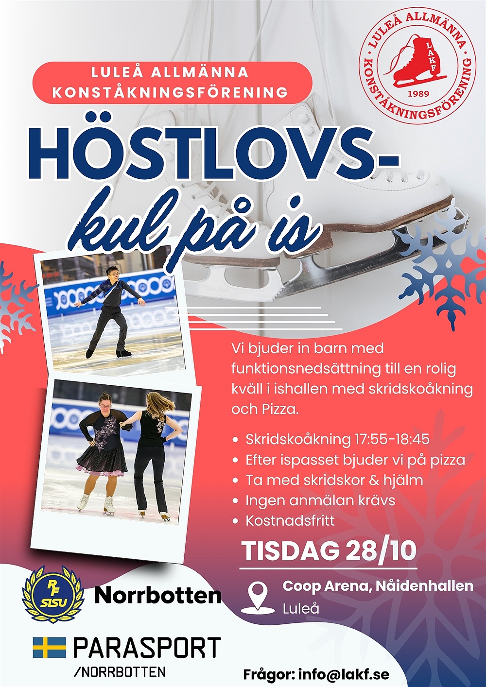 Vi bjuder in barn med funktionsnedsättning till en rolig kväll i ishallen med skridskoåkning, efter avslutat ispass bjuder vi på pizza.