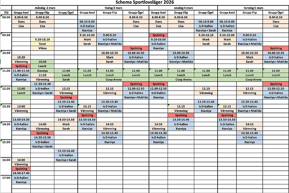 Notera att dagen slutar och startar i den hall som först/sist passet är i. Har ni Dans på morgonen så startar ni dagen där och går sedan gemenast till ishallen.